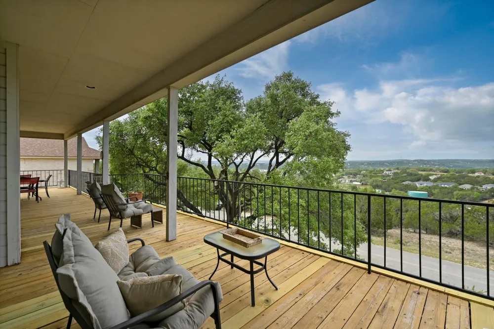 Expansive Lakeview Retreat in Lago Vista! Soak in panoramic Lake Travis views from nearly every room of this spacious 3,413 sq. ft. on a single-level sanctuary perched on a generous lot overlooking the former Lago Vista golf course. There is an additional air-conditioned room on the lower level under the main living level of the home that gives you the option to make it into your own desired space. This custom-built 3-bed, 3.5-bath home is a rare blend of timeless design and thoughtful function ideal for both full-time residents and second-home seekers craving serene living. Enjoy sunrise reflections off the water from the expansive deck or through four sets of sliding glass doors that seamlessly unite indoor and outdoor living. Inside, you’ll find a warm, inviting kitchen with solid wood cabinetry, brick backsplash, and black appliances, perfectly situated at the heart of the home. The primary suite offers luxury and privacy with a deep soaking tub, dual-entry walk-in closet, and even a cedar-lined bonus closet—plus private access to the lake-facing balcony. Each bedroom features its own private en-suite, ideal for guests or multigenerational living. This home was designed for comfort and ease, boasting a flexible laundry/sewing room, central vacuum, abundant storage, and an oversized garage with golf cart access. Large windows flood the home with natural light, framing breathtaking views and creating an uplifting ambiance throughout. Whether you're relaxing fireside, hosting on the deck, or considering the investment potential of the golf course's rumored return, this property offers the lifestyle and legacy you've been waiting for. Don't miss your chance to experience lakeside living with space, style, and future upside.
